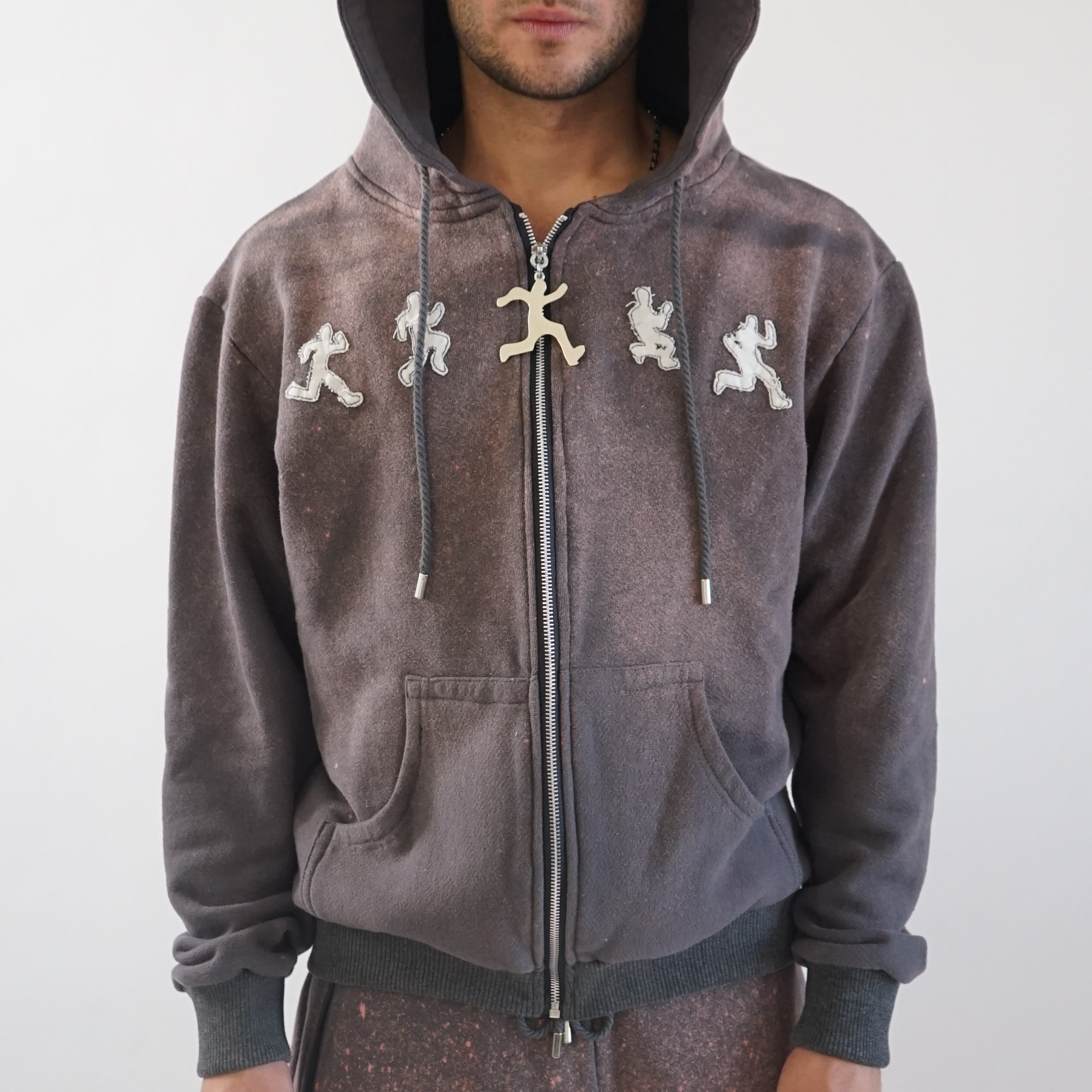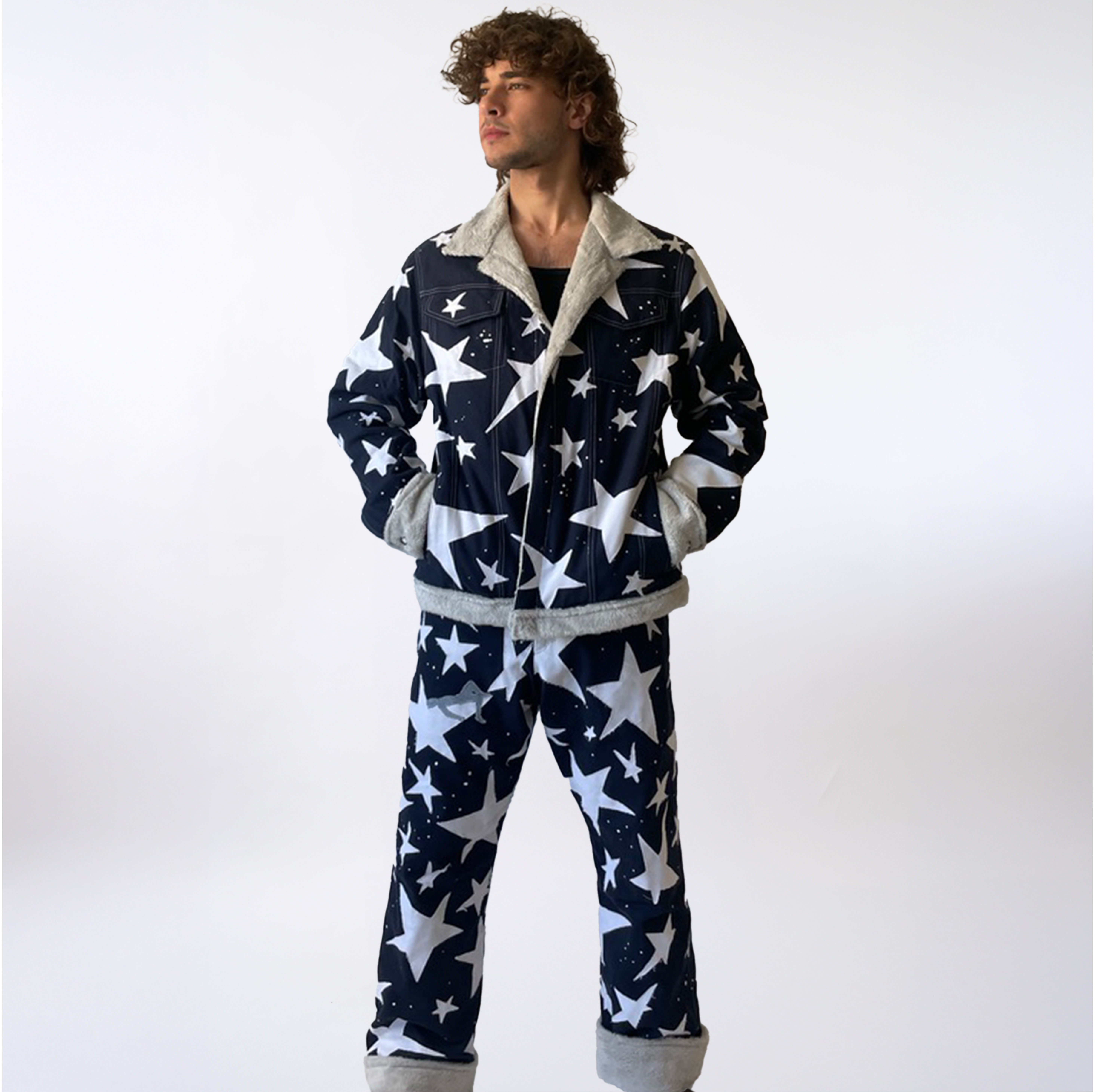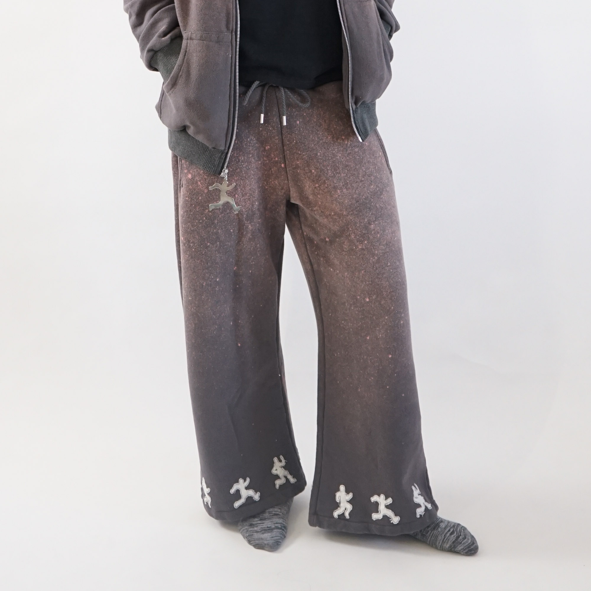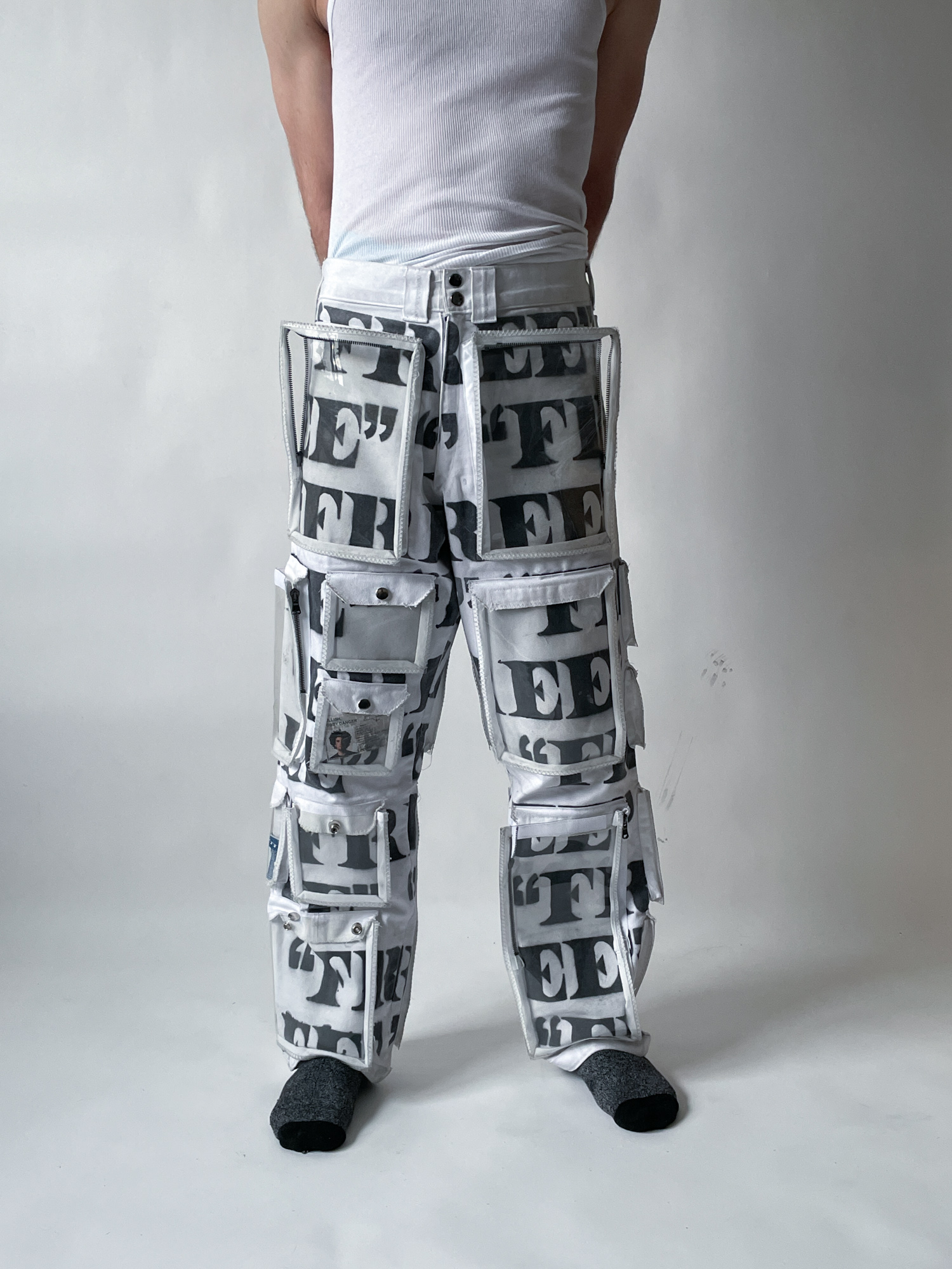 Arsenal Pants feature printed firearms, ammunition, and explosives scattered across the fabric, paired with clear vinyl pockets that expose these images directly to the outside world.