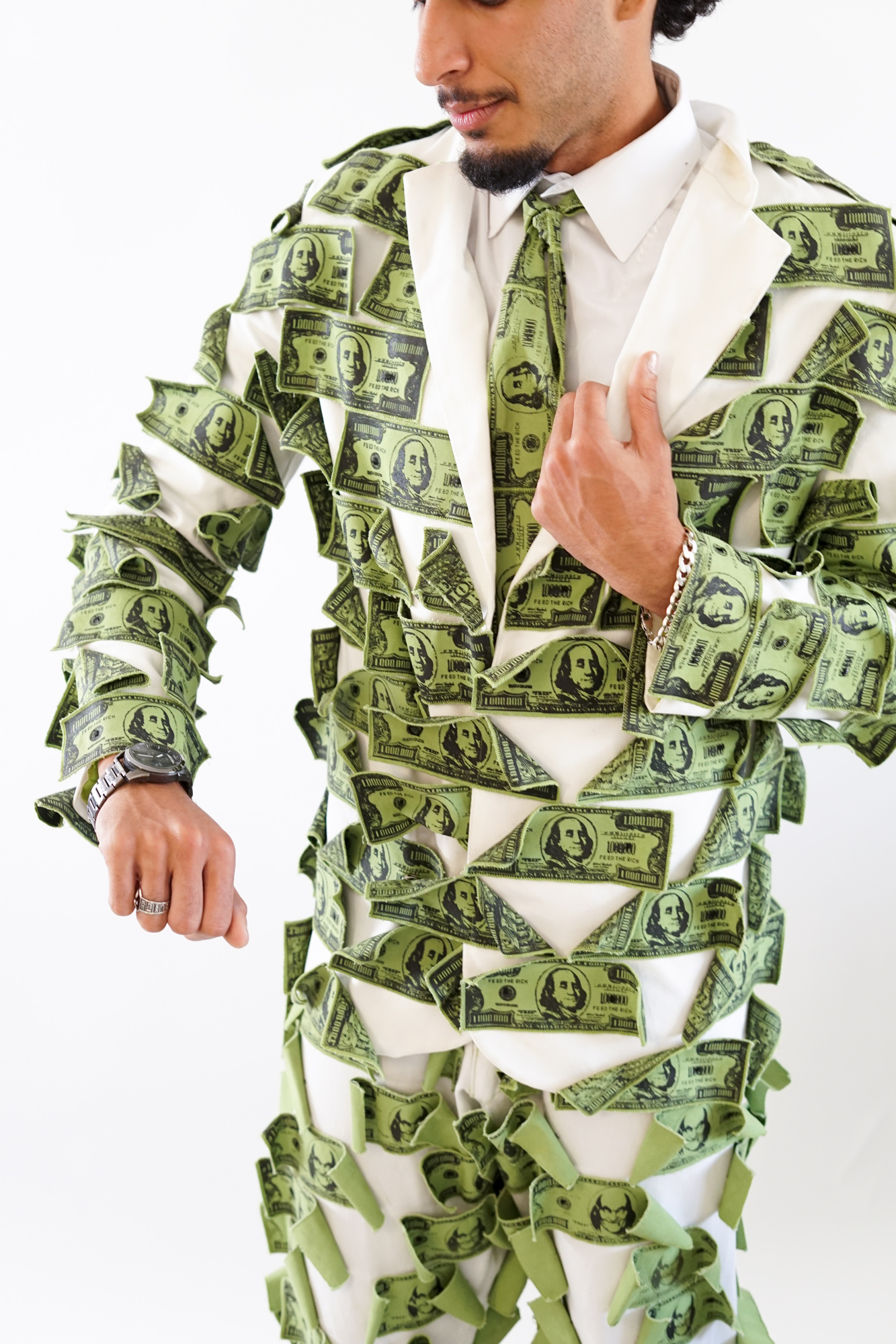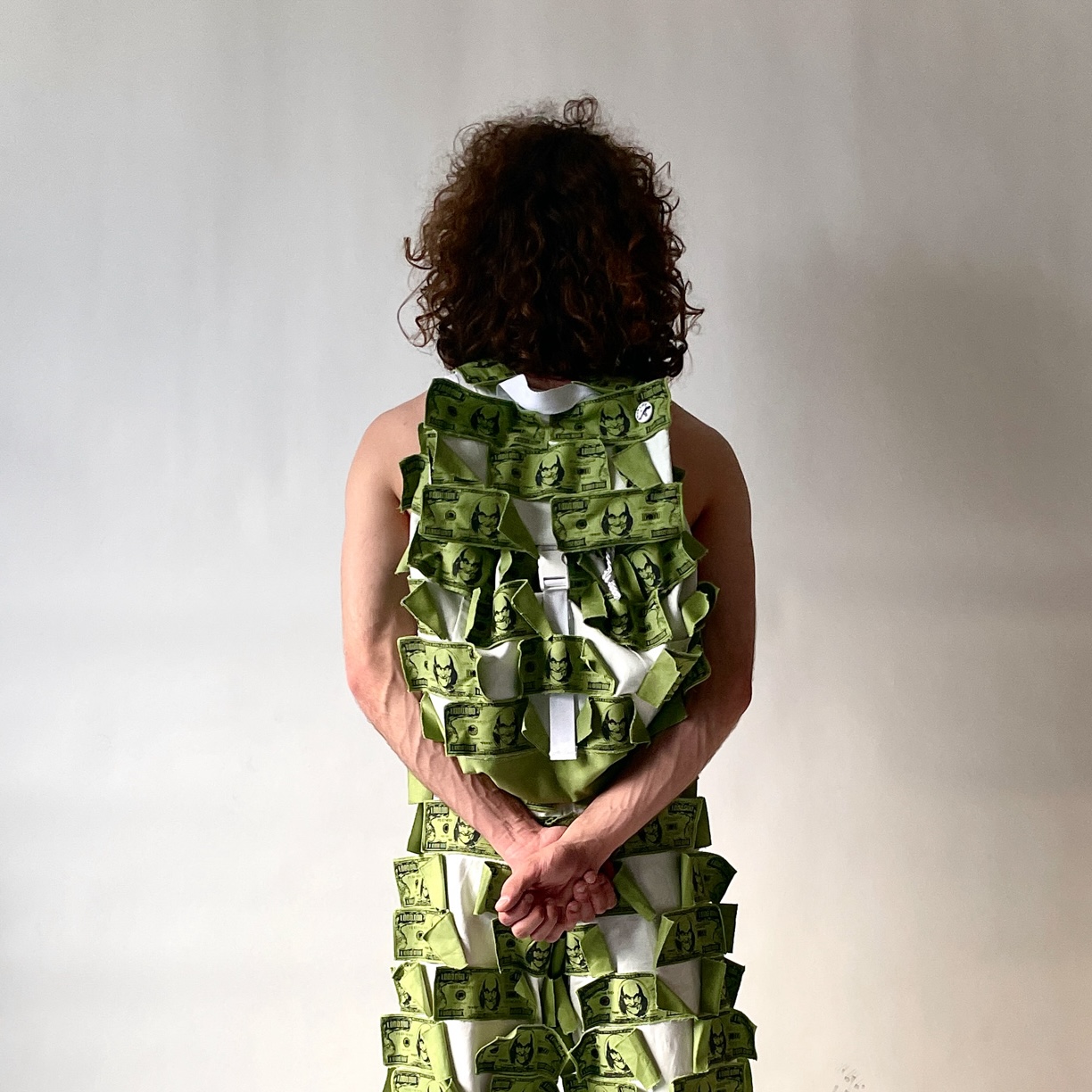 The Million Dollar Duffel Bag is a massive, sculptural carryall covered in custom “One Million Dollar” bills that ripple, and clash against each other in motion.