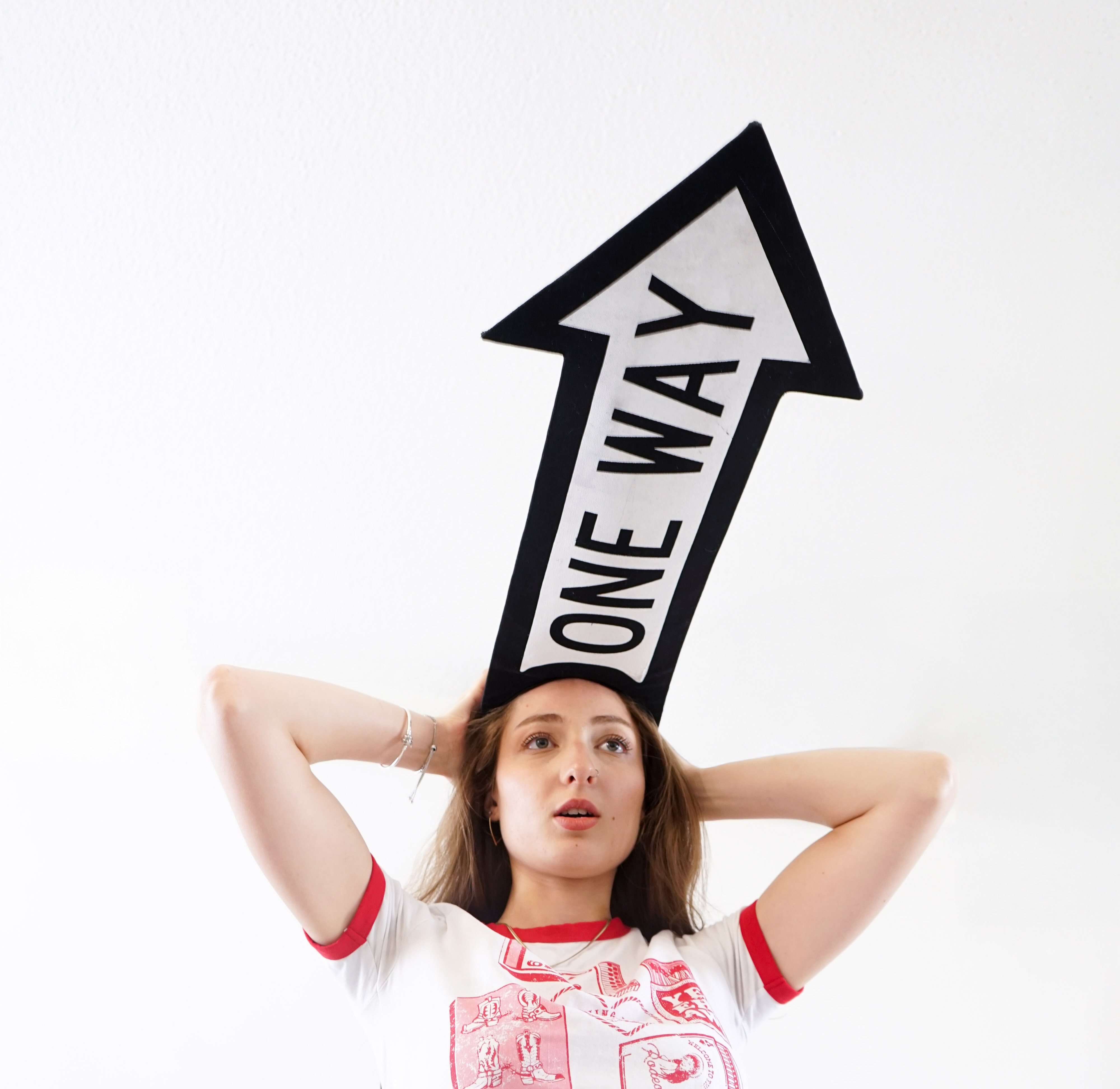 The One Way Hat fuses two NYC icons, the snapback and the street sign, into a single, oversized statement. Featuring a massive, stiffened brim shaped like a “ONE WAY” sign.
